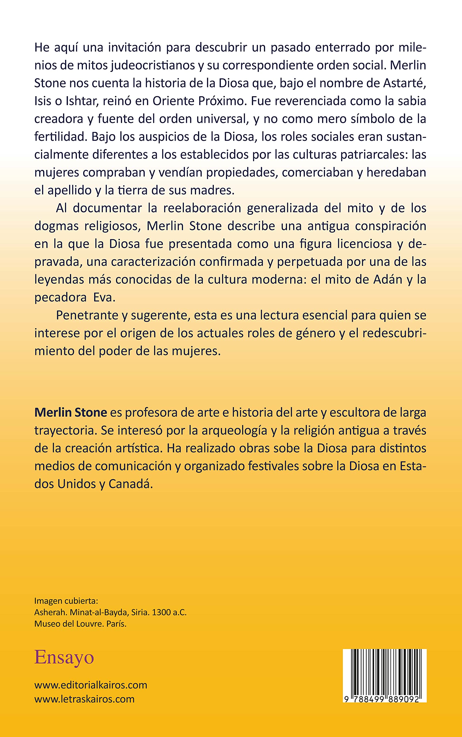 He aquí una invitación para descubrir un pasado enterrado por milenios de mitos judeocristianos y su correspondiente orden social. Merlin Stone nos cuenta la historia de la Diosa que, bajo el nombre de Astarté, Isis o Ishtar, reinó en Oriente Próximo. Fue reverenciada como la sabia creadora y fuente del orden universal, y no como mero símbolo de la fertilidad. Bajo los auspicios de la Diosa, los roles sociales eran sustancialmente diferentes a los establecidos por las culturas patriar- cales: las mujeres compraban y vendían propiedades, comerciaban y heredaban el apellido y la tierra de sus madres.