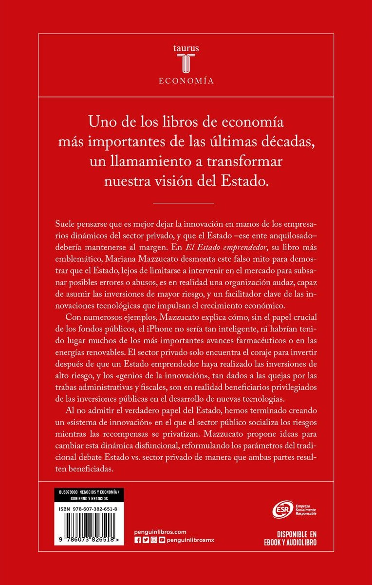 Al no admitir el verdadero papel del Estado, hemos terminado creando un «sistema de innovación» en el que el sector público socializa los riesgos mientras las recompensas se privatizan. Mazzucato propone ideas para cambiar esta dinámica disfuncional, reformulando los parámetros del tradicional debate Estado versus sector privado de manera que ambas partes resulten beneficiadas.