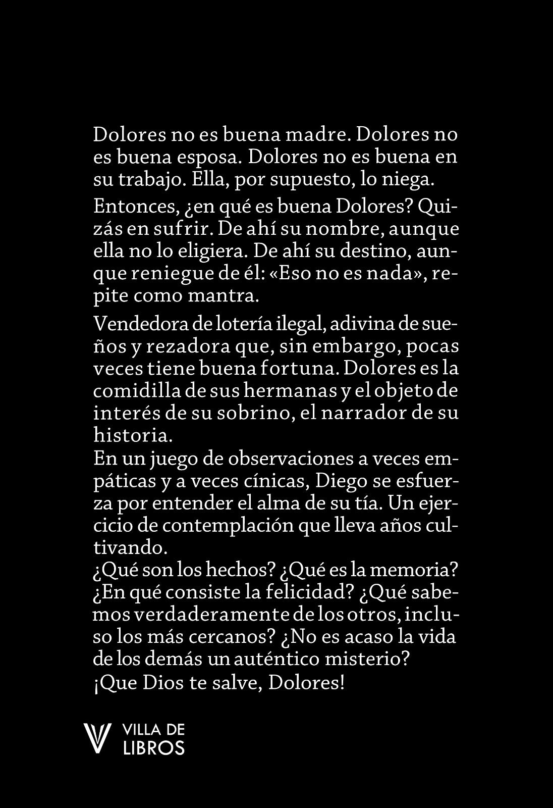 Entonces, ¿en qué es buena Dolores? Quizá en sufrir, De ahí su nombre, aunque ella no lo eligiera. De ahí su destino, aunque reniegue de él: " Eso no es nada", repite como mantra.